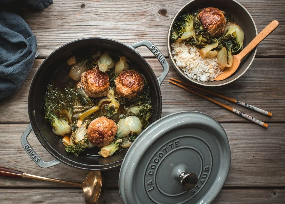 - Once broth is boiling, add meatballs back in, cover and turn heat down to a simmer. Braise 20-30 minutes or until meatballs are cooked through (at least 165°F and greens are tender and wilted to your liking. I love it when the bok choy is sooo tender that they're almost dissolving into the broth so I go on the longer end for sure.