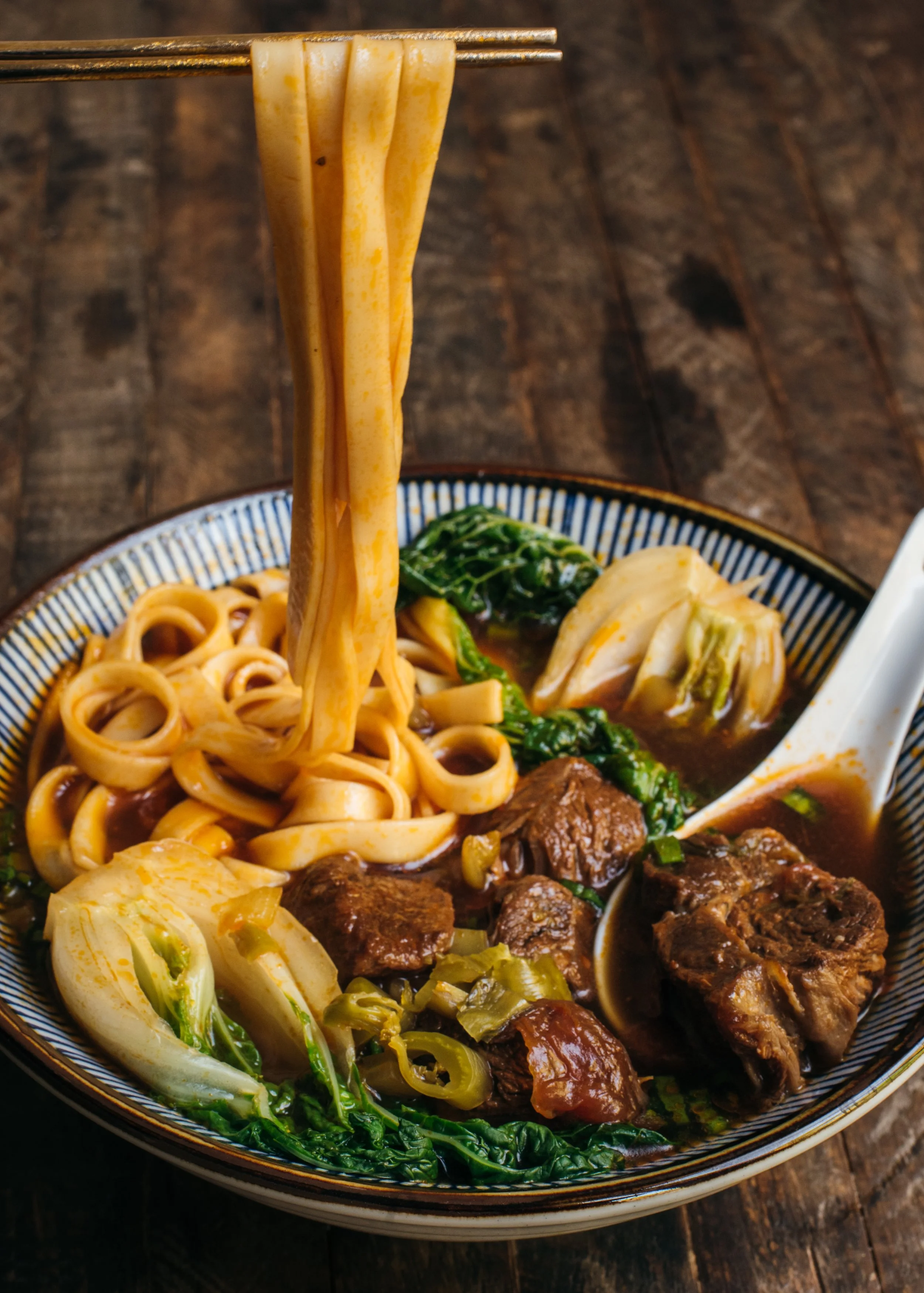 - Serve: Bring beef and broth to a strong simmer to ensure everything is piping hot. Taste broth and adjust seasoning if needed (salt, soy sauces, sugar). Ladle beef and broth over the noodles and leafy greens. Serve immediately with reserved scallions, chili oil and/or pickled mustard greens.