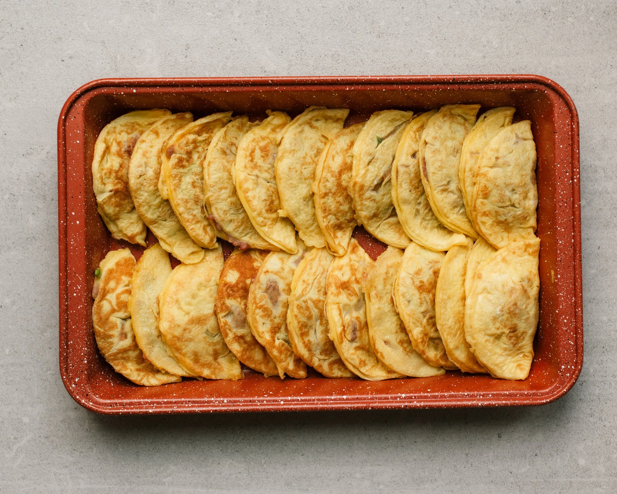 My hack is to pour egg inside small baking rings on a skillet to form the crepe wrapper. This allows me to make two at a time with ease. When I tag-teamed with my daughter Elise, we were knocking out 4 at a time. She loved the process! FYI my rings are 3.5” English muffin rings but any similarly sized 3” to 3.5” cookie cutter will work.