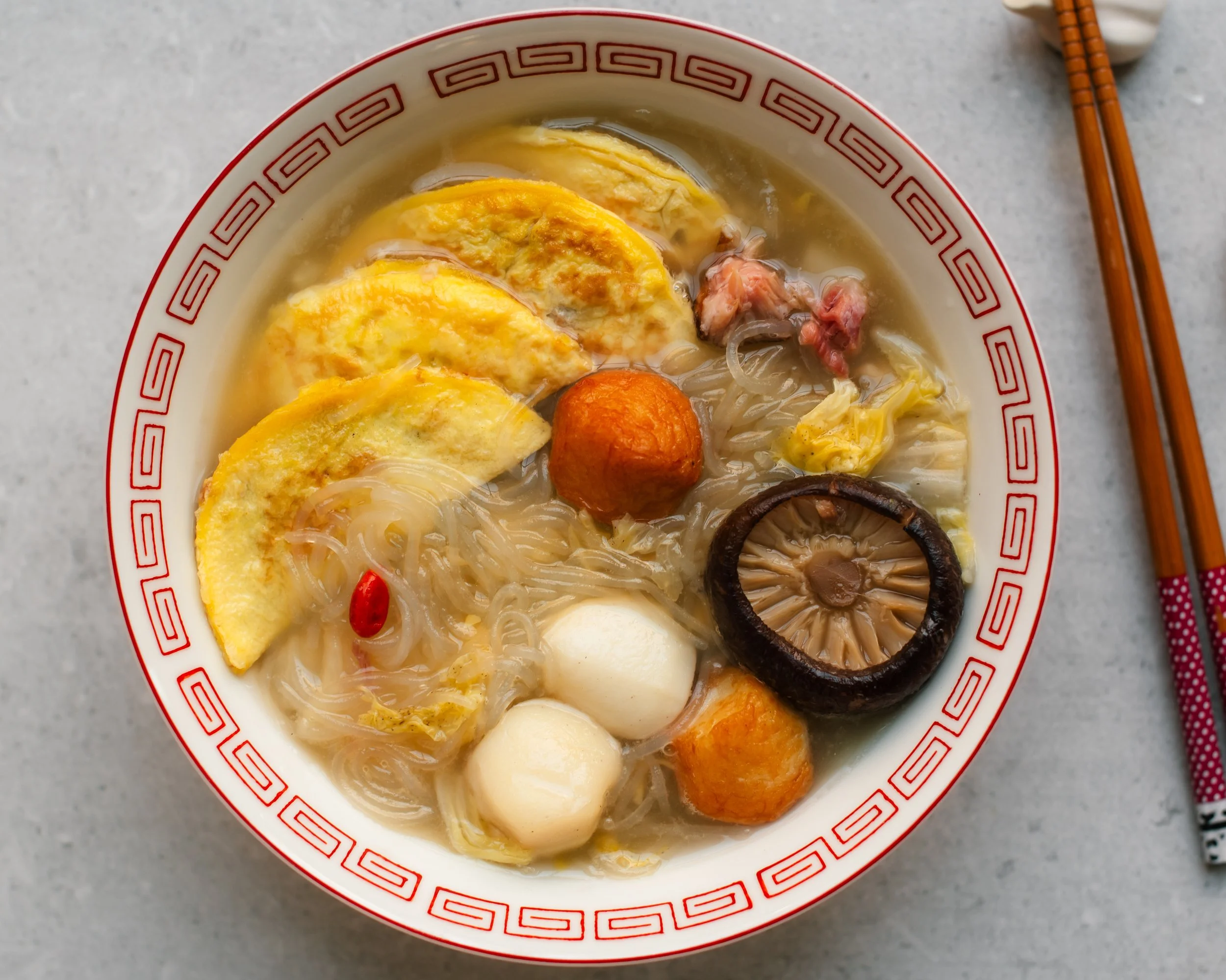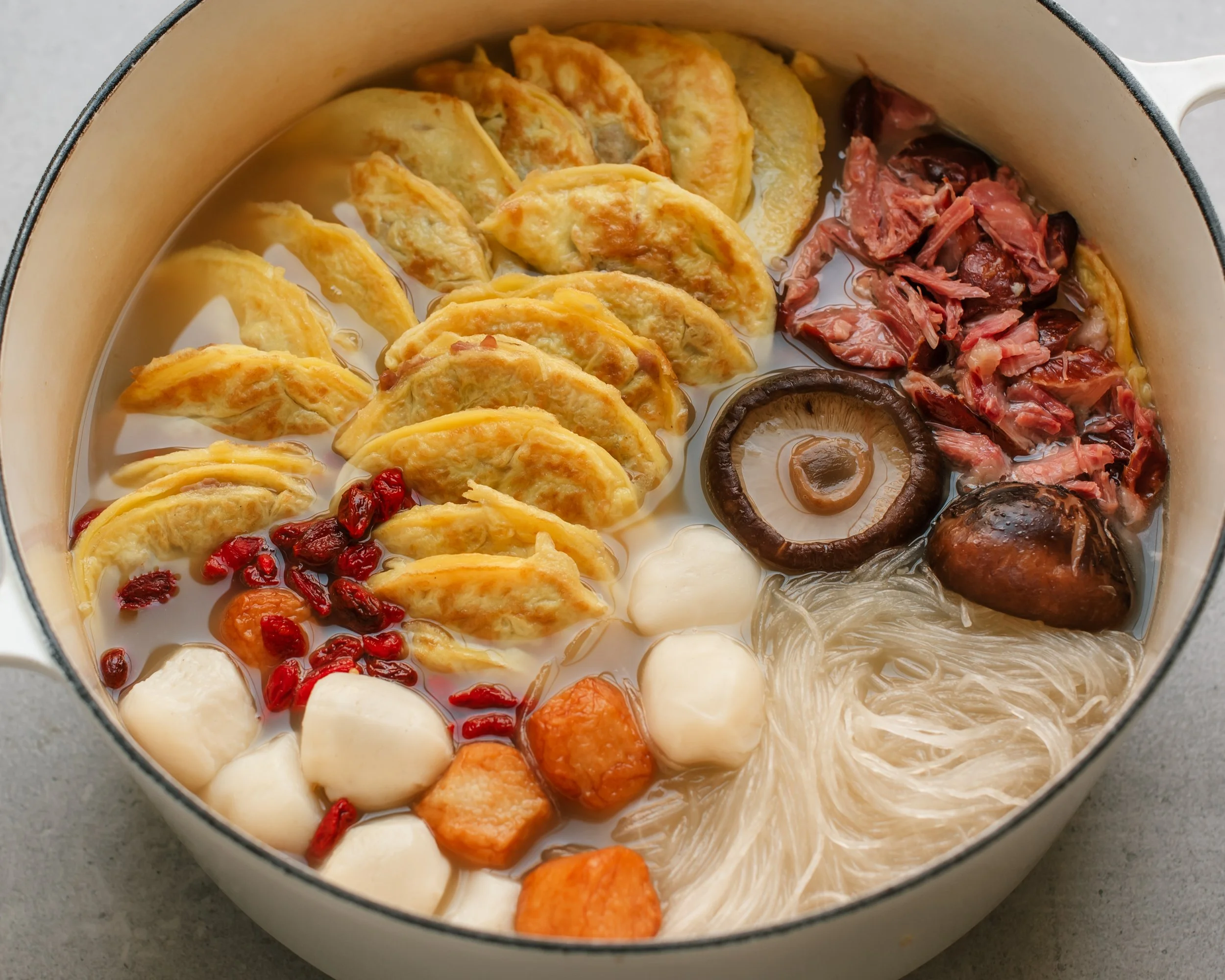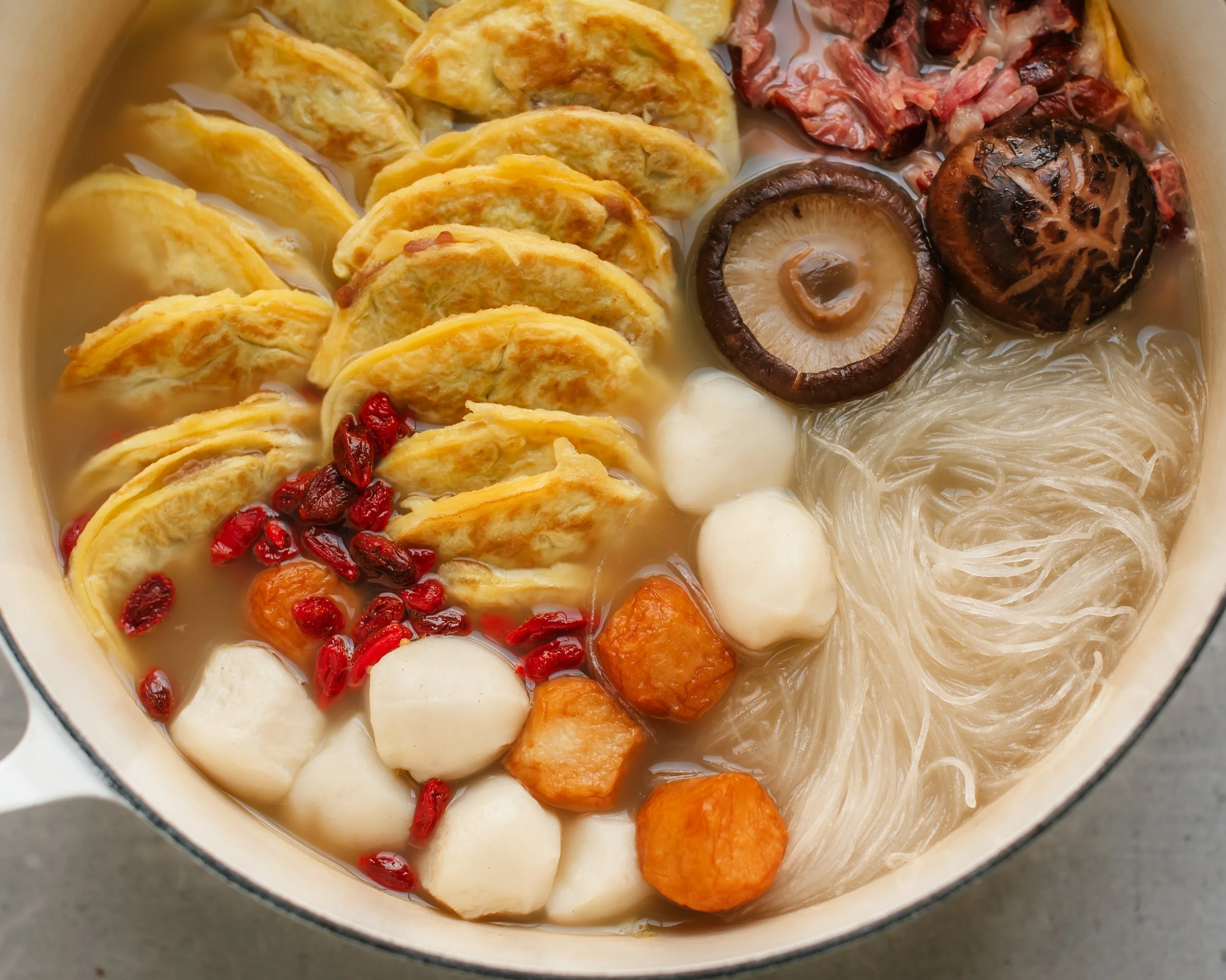 - Add remaining soup ingredients: Into a large pot, add napa cabbage, shiitake mushrooms, and ginger slices. Season cabbage with salt. Add broth, cover to bring to a boil, and simmer 10 minutes. Taste one final time and season with salt and/or soy sauce to taste. Add egg dumplings, fish balls, mung bean vermicelli, goji berries and shredded ham hock meat. Simmer 5 minutes or until everything is heated through and egg dumpling filling is cooked. Divide between serving bowls, garnish with reserved scallions and enjoy as is, or with a bowl of rice.