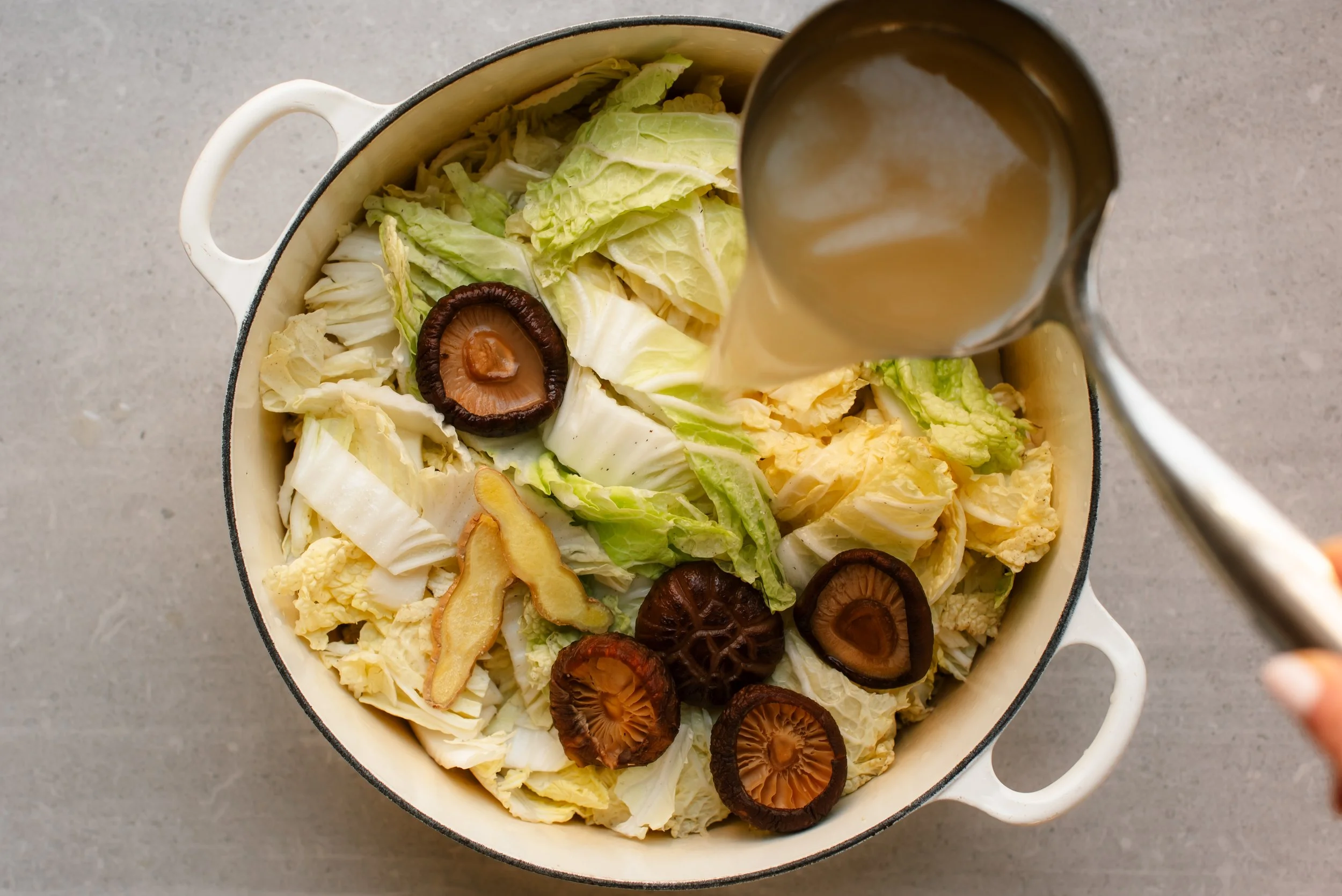 Into a large pot, add Napa cabbage, shiitake mushrooms and ginger slices. Season with salt and add broth.