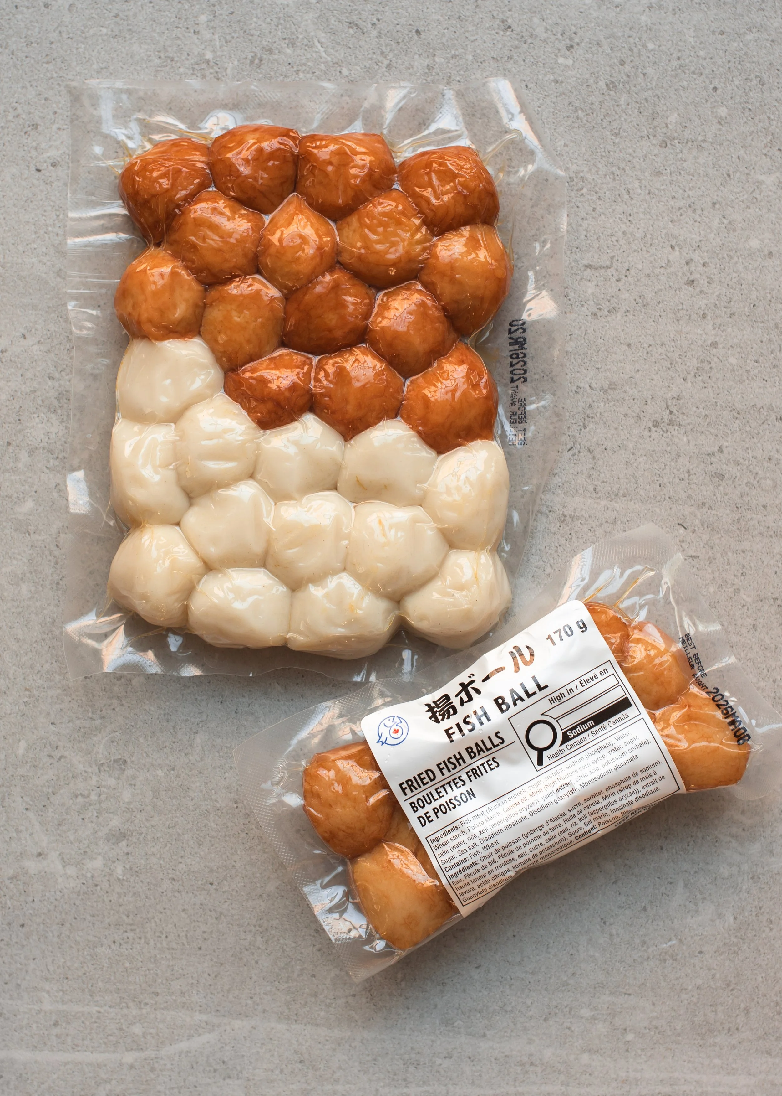 They are bite sized balls made from pureed fish paste. The paste is mixed with starch and seasonings, shaped into balls, then boiled, steamed or deep fried (orange-hued fish balls are deep fried). They have a bouncy, slightly chewy “QQ” texture that I find so addictive to eat! Since they are already cooked, they only need to be heated back through. Fish balls are commonly used in soups, hot pot, noodles or as a snack in many East Asian cuisines. Find them vacuum-packed and sold out of a fridge section at most Chinese, Japanese and Korean supermarkets.
