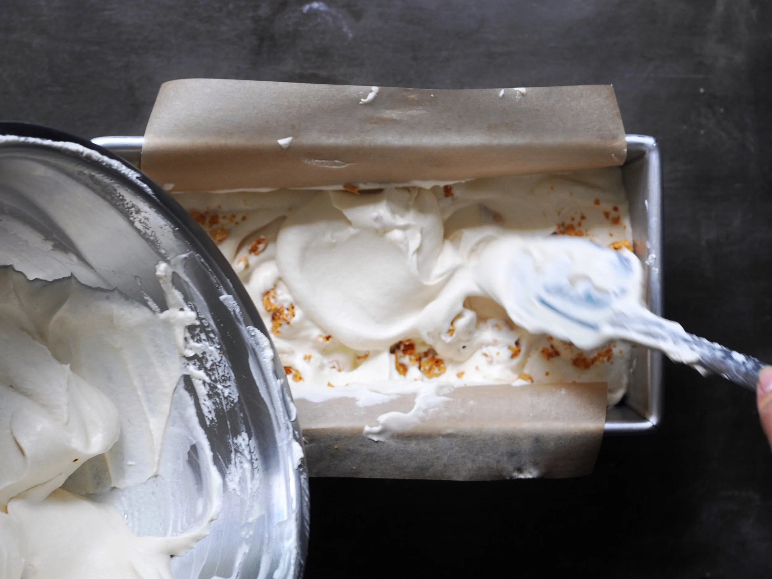 10. Layer the ice cream base and coffee honeycomb crunchies in a freezer-safe container. Use a spatula to first scrape half of the ice cream base into the container. Sprinkle with broken coffee honeycomb crunchies. Add remaining ice cream base on top and smooth out the top. Press a piece of parchment paper against the surface to prevent ice crystals from forming during freezing. Close airtight lid or wrap the container with plastic wrap. You may even want to put it into a zip top freezer bag for additional insulation.